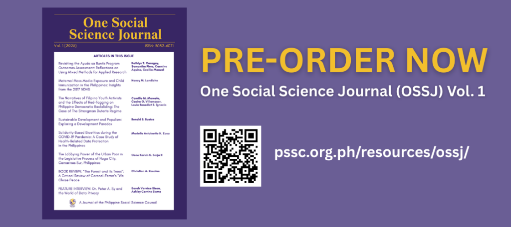 We encourage academic and research librarians to include the One Social Science Journal in their library collections. OSSJ is published by the Philippine Social Science Council and is available through institutional and individual subscriptions.